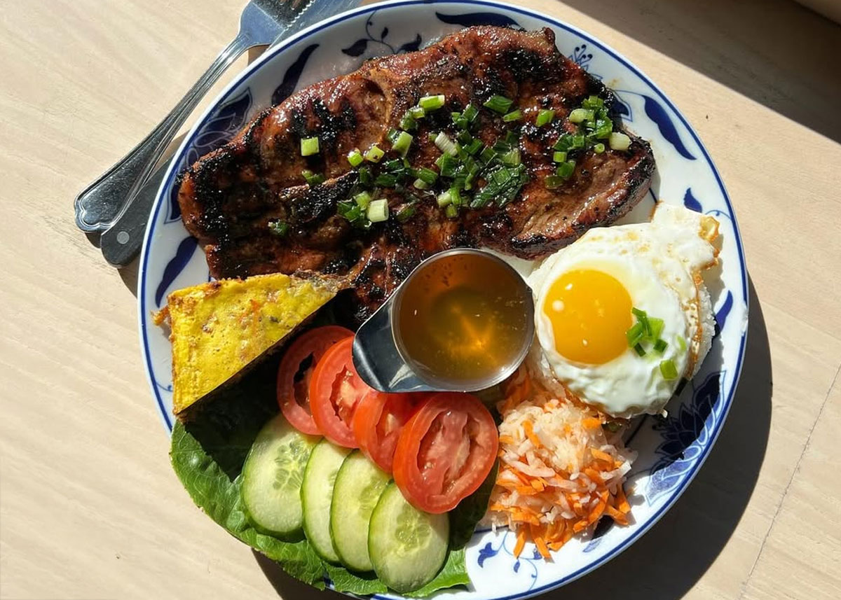 Broken rice with grilled meats, pickles, scallion oil. Go classic with pork chop or Đặc Biệt-style.